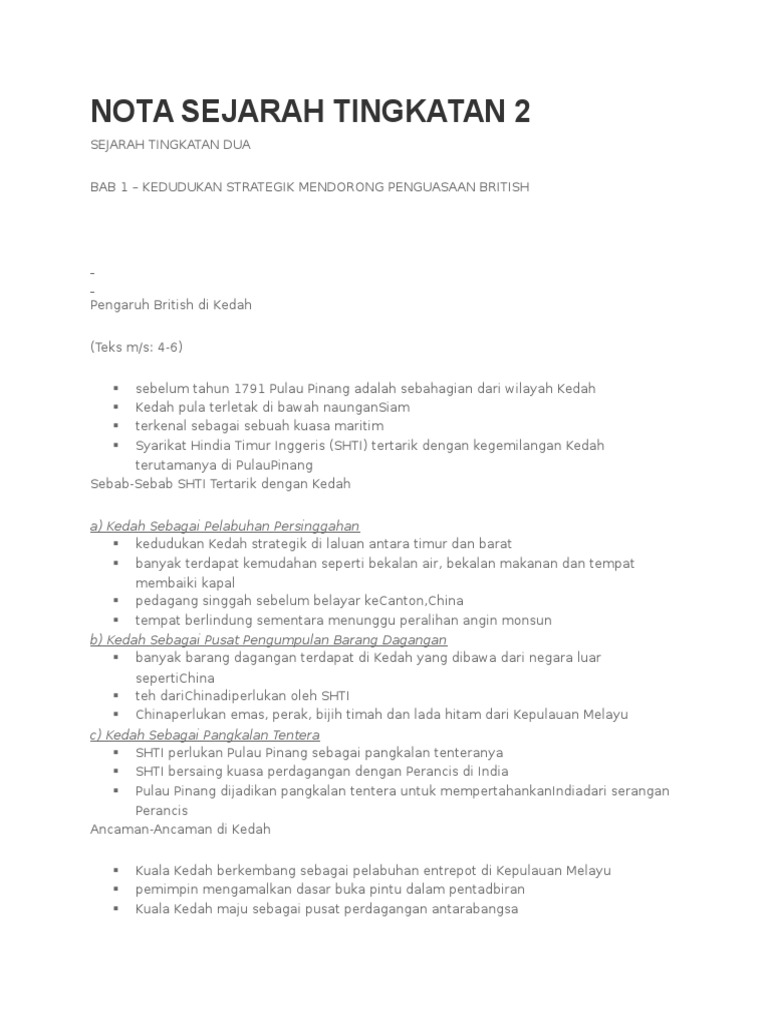 Pilih soalan yang anda rasa selesa untuk di jawab dimana anda boleh melukis objek tema yang diberi dengan baik. BAB 1 KEDUDUKAN STARTEGIK MENDORONG PENGUASAAN TINGKATAN 2 BRITISH SHTI ditubuhkan pada 1600 untuk menjalankan isteri keturunan raja sebagai warisnya perdagangan dan meluaskan jajahan di timur. Nota Sejarah Tingkatan 2 1.
